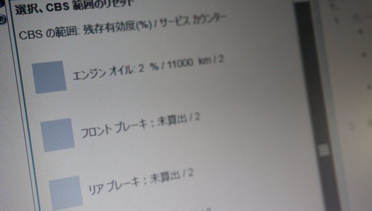 ブレーキパッド交換後は診断機を繋いで残量リセットを行いカウンターを引き上げます。