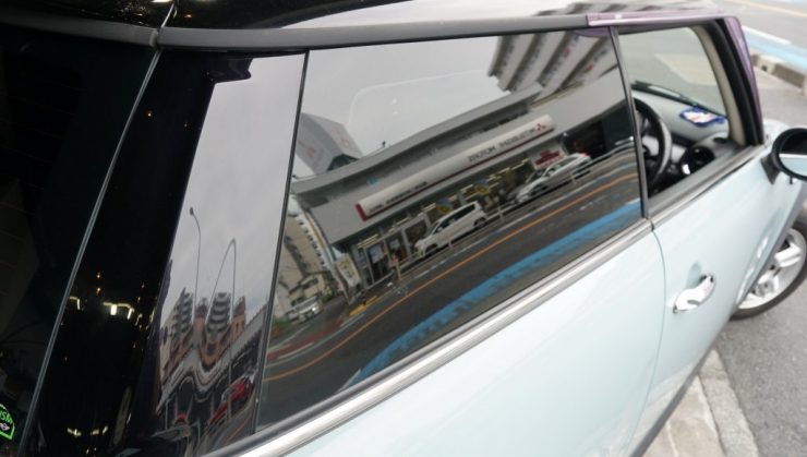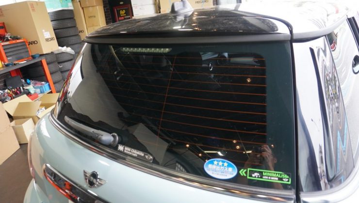 リア3面スモークフィルム施工。実はこういった作業も承っております。