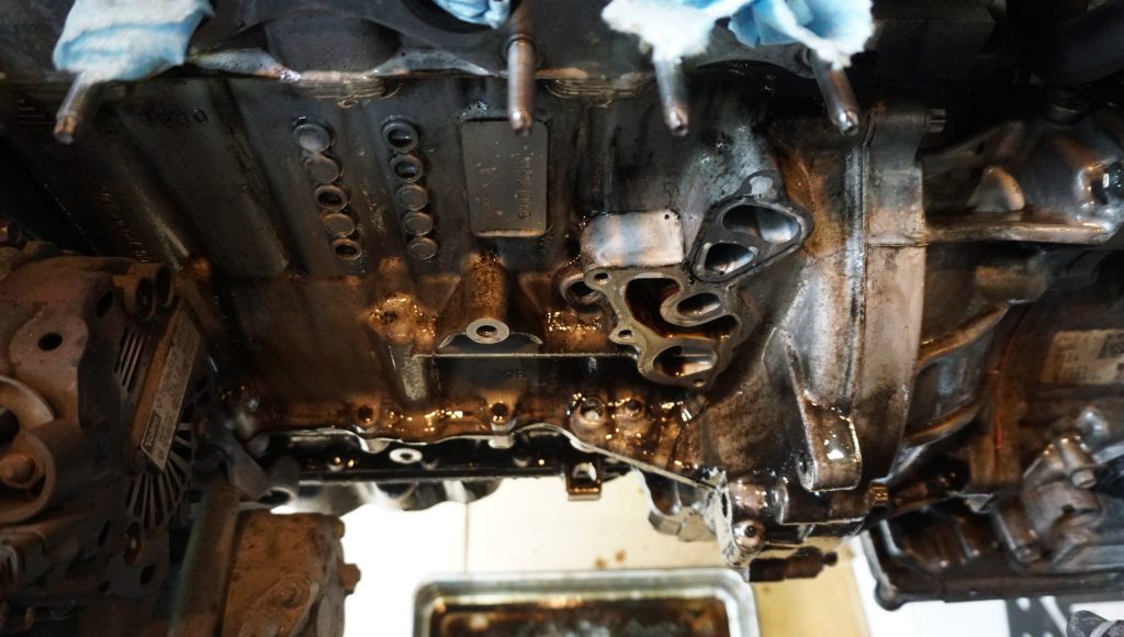 こんな感じでキャタライザー周辺のエンジンブロックがオイルまみれ、、![]()
