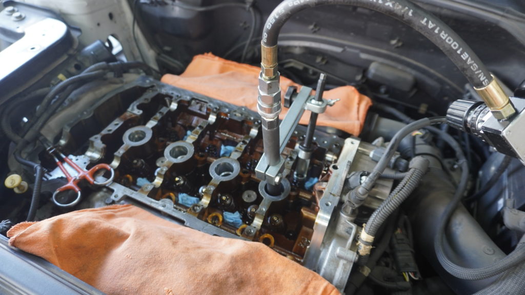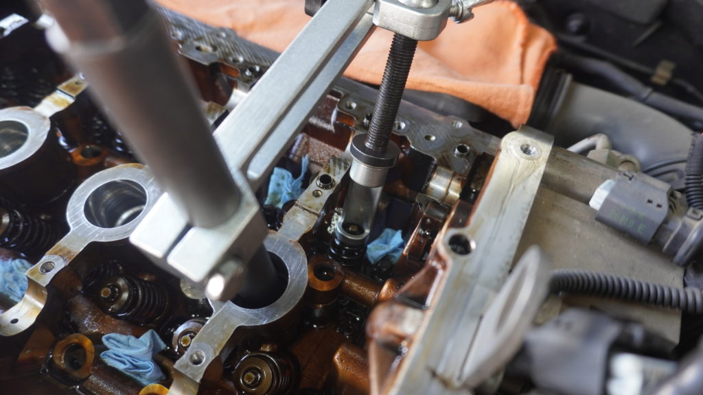ということでエンジンのヘッドカバーを開けて、バルブトロニックのメカを外して、タイミングチェーンやカムシャフト等外して、このような器具をセットしまして、、