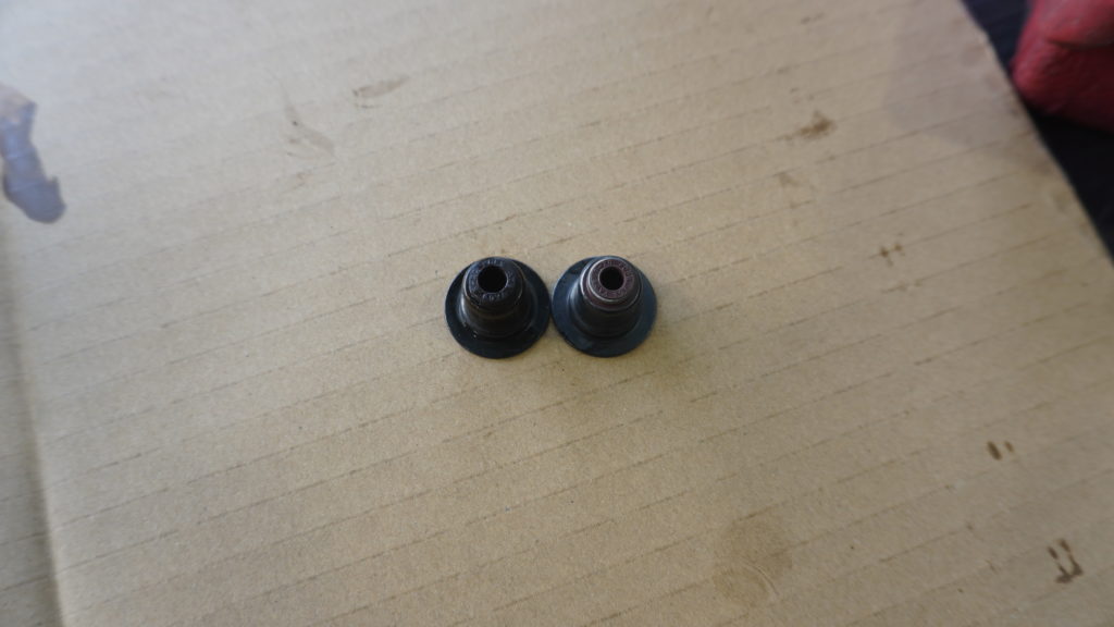チョット暗いですが、外したバルブステムシールと新品を比較しますと、中心の穴が広がっていますね、、これによりオイル下がりが発生する訳です。